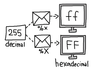 '%X' 와 같이 표현하면 그 위치에 대문자 16진수(heXadecimal)로 출력한다.