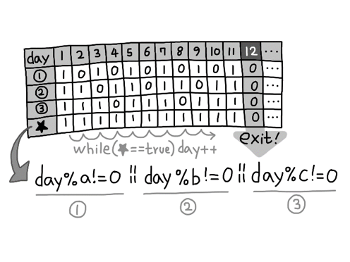 while(day%a!=0 || day%b!=0 || day%c!=0) day++; //이게 무슨 의미일까?