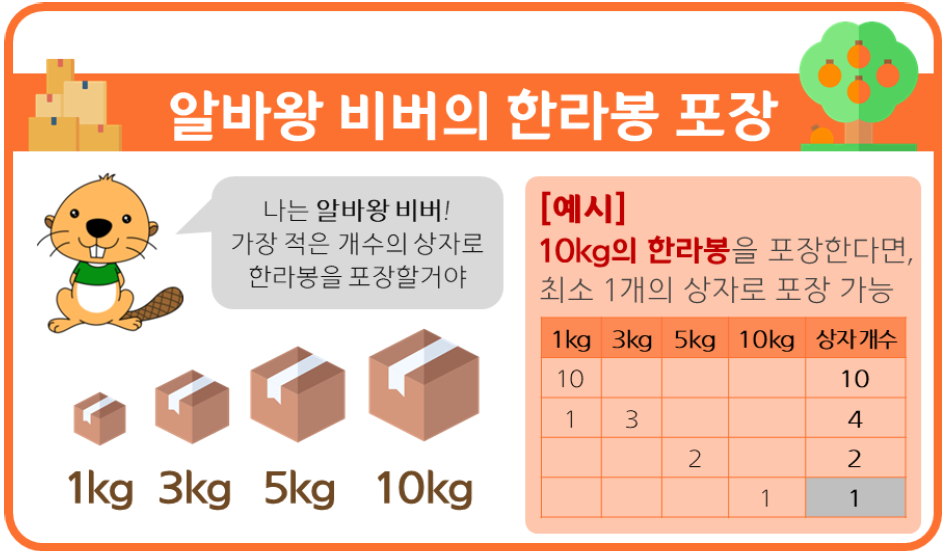 예를 들어, 3kg의 한라봉을 포장하기 위해서는 1kg 상자 3개가 아닌, 3kg 상자 1개를 사용해야 한다.