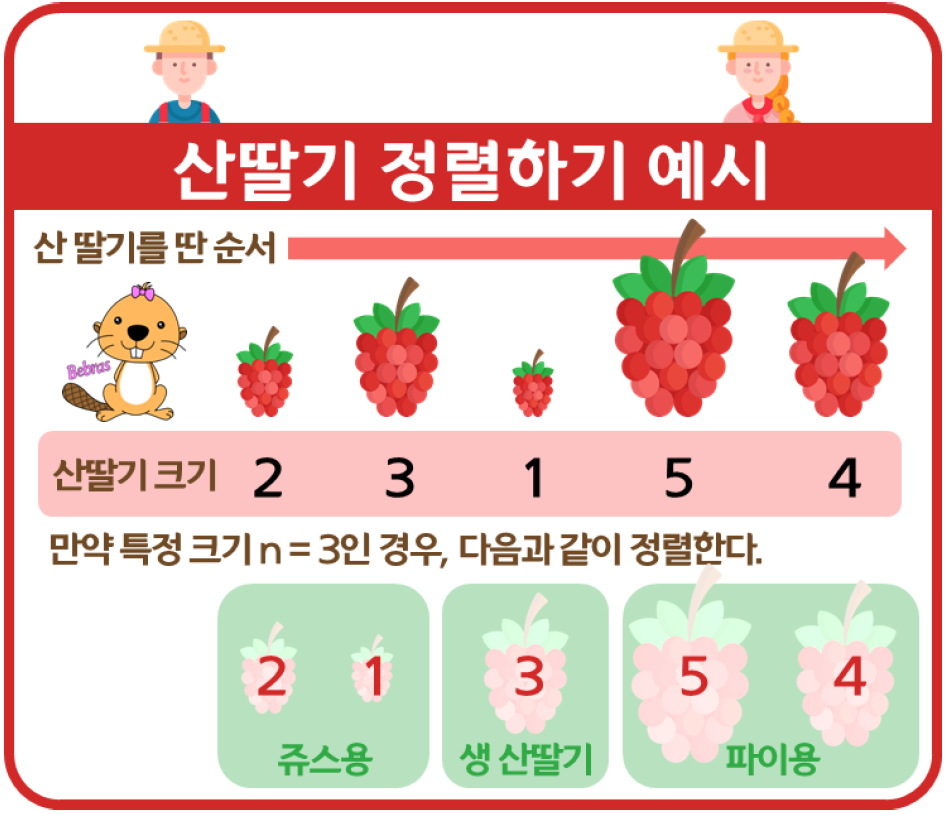 - 특정 크기(n)보다 큰 산딸기는 파이로, 특정 크기(n)보다 작은 산딸기는 쥬스로 만들어 먹는다.