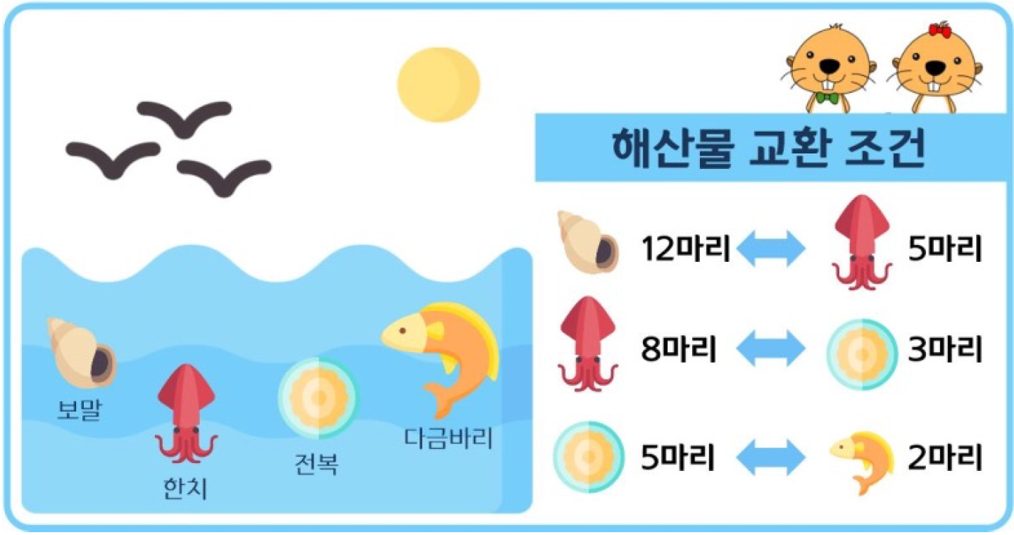제주 앞바다에서 보말('바다 고둥'의 제주 방언)을 채취한 해녀 비버가 장터에서 다른 해산물과 교환하려 한다. 장터에서는 아래 기준으로 해산물을 교환할 수 있다.