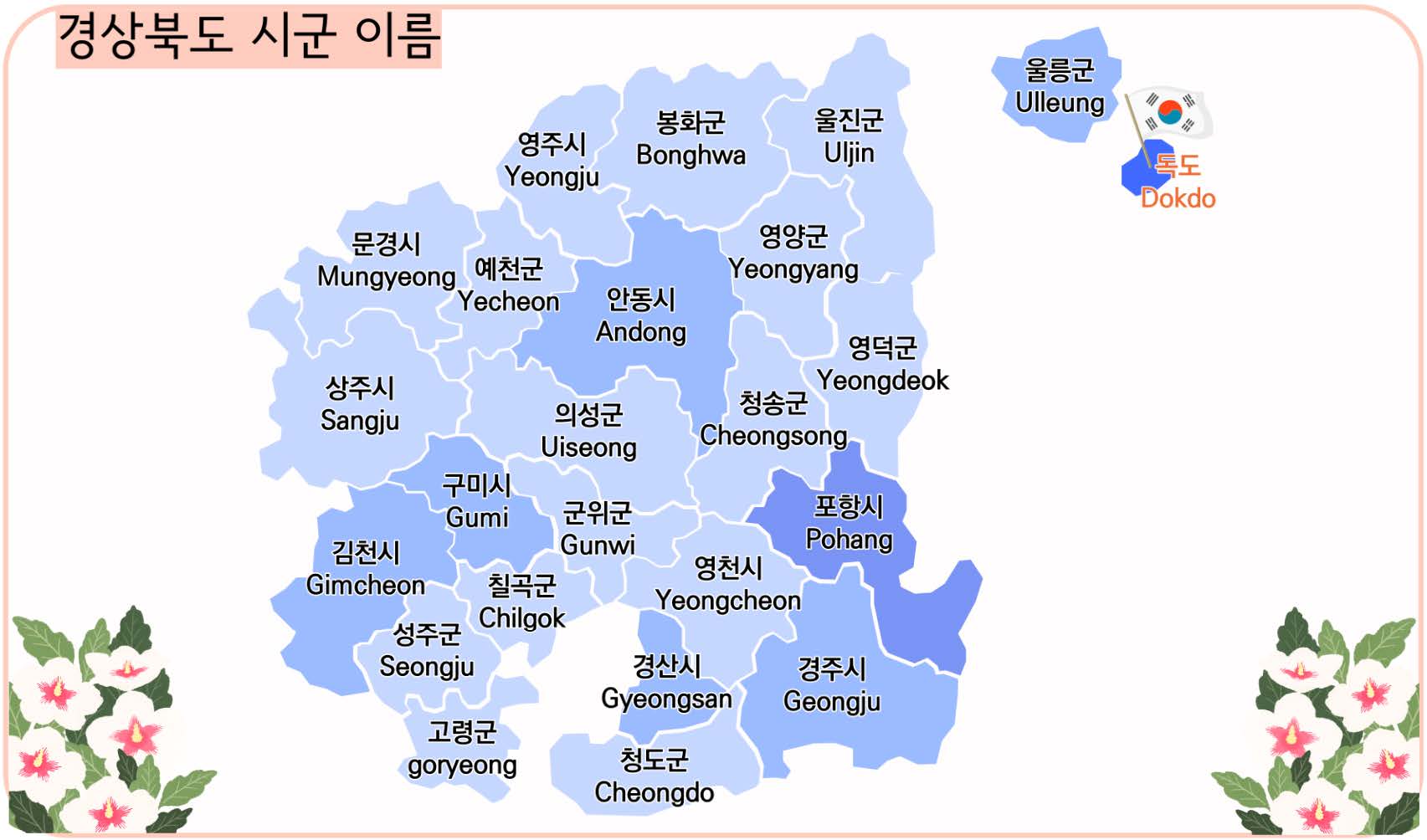 경상북도를 찾는 외국인들은 여행하고 싶은 시와 군의 영문 이름 중 부분 문자열(substring)을 입력하면 해당 지역의 정보를 검색할 수 있다.