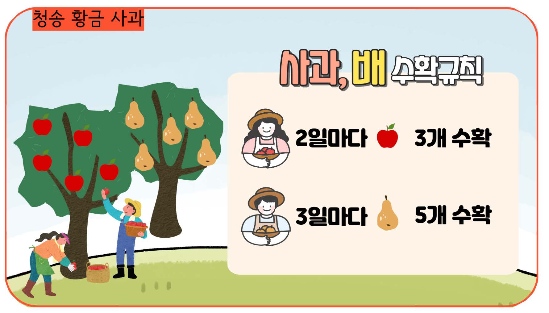 스마트 농법으로 자동 운영되는 어떤 특별한 과수원에 사과나무와 배나무가 함께 심어져 있는데, 다음과 같은 규칙으로 사과와 배가 수확된다.