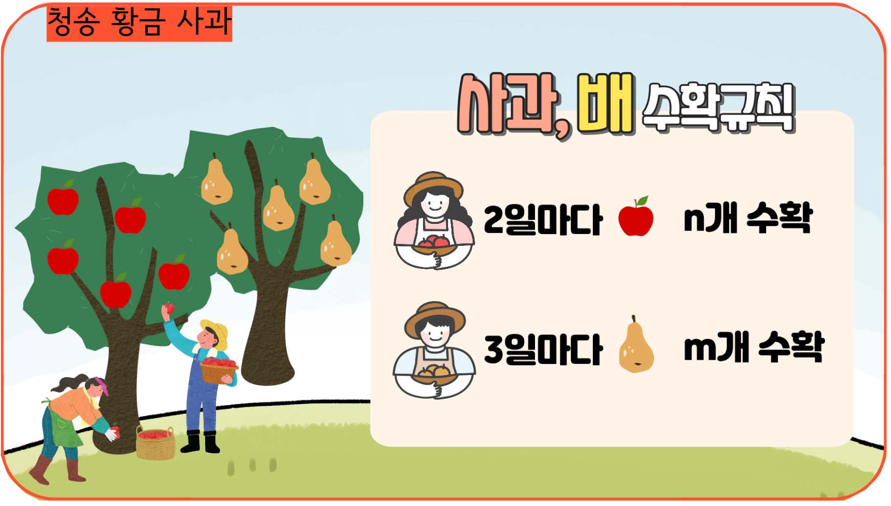 스마트 농법으로 자동 운영되는 어떤 특별한 과수원에 사과나무와 배나무가 함께 심어져 있는데, 다음과 같은 규칙으로 사과와 배가 수확된다.