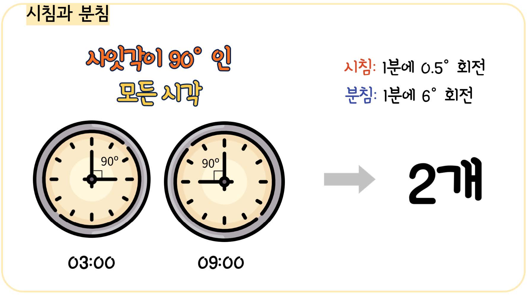 00:00에 시침과 분침의 사잇각은 0도이고, 08:40에 시침과 분침의 사잇각은 20도이다. 한편, 시침과 분침의 사잇각이 90도인 경우는 03:00와 09:00, 단 2번 뿐이다.
