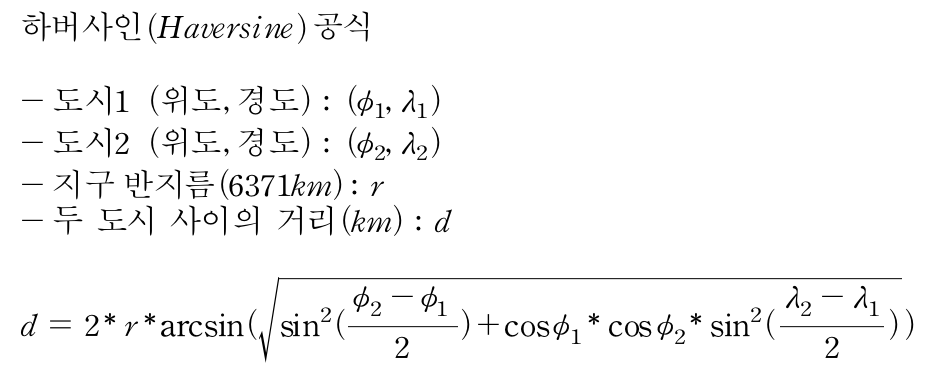 * 지구를 완벽한 구로 가정하였을 때, 두 도시 사이의 직선 거리는 하버사인 공식(Haversine formula)으로 계산할 수 있다.
